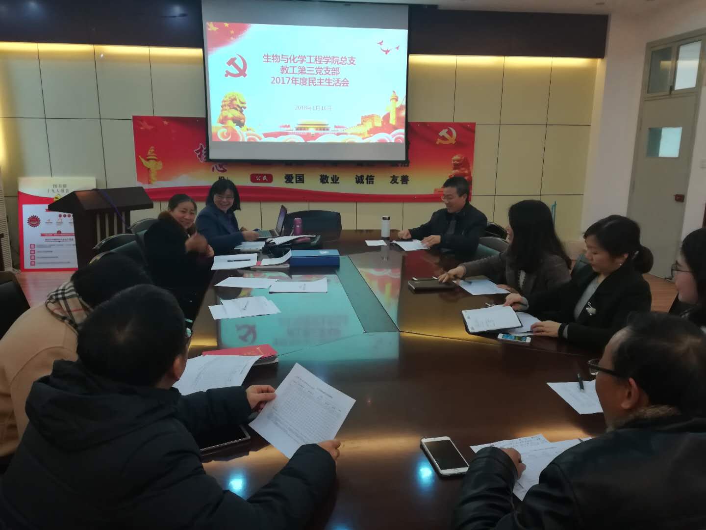 2018年1月16日下午,根据学校召开2017年度党支部组织生活会和开展民主评议党员工作的通知要求,生化学院教工第三党支部在学院“党员之家”召开2017年度组织生活会议。会议由支部书记沈昊宇主持,第三党支部全体党员出席。
