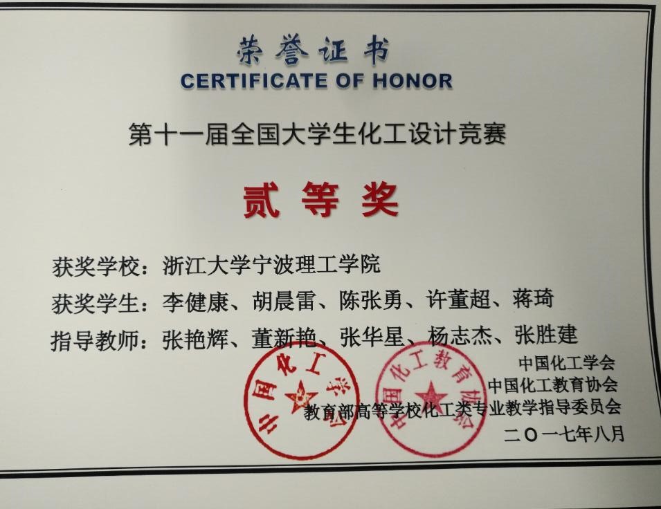 2017年8月18日至23日,由中国化工学会、中国化工教育协会、教育部高等学校化工类专业教学指导委员会主办的2017第十一届全国大学生化工设计竞赛全国总决赛于在浙江大学玉泉校区举行。由我院张艳辉、董新艳等老师指导的学生团队(队员:李健康胡晨雷陈张勇许董超蒋琦)经过严格的层层选拔和比拼,最终获得全国二等奖。